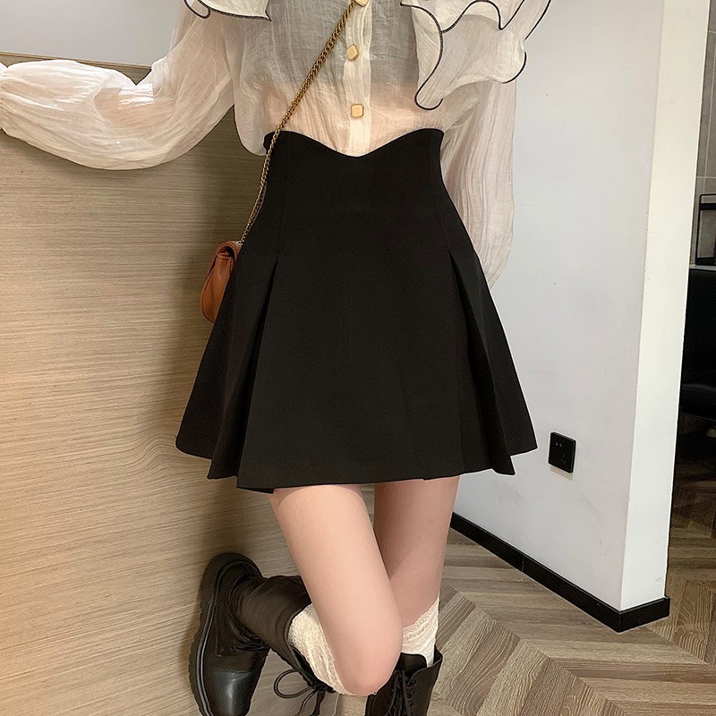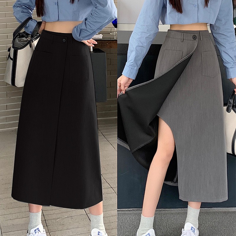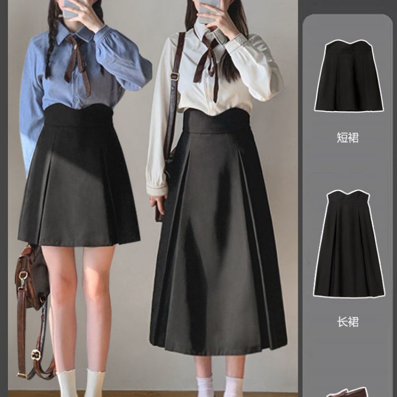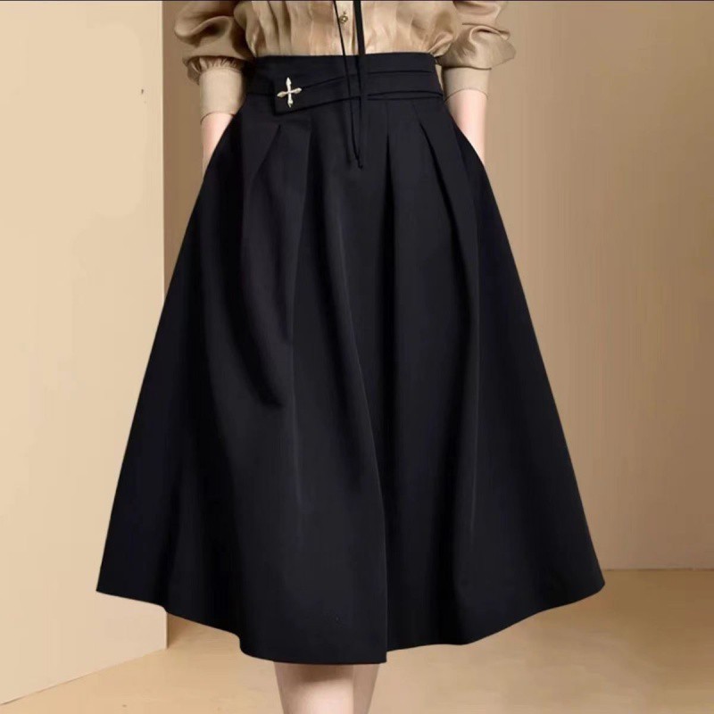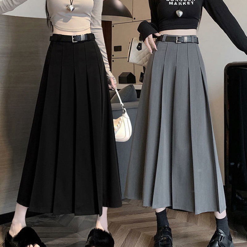 スーツの生地のプリーツのスカートのロングスカートの2024の新型の韓国版のシンプルな黒色の灰色のフランスの高い腰はやせているa字版を現します。