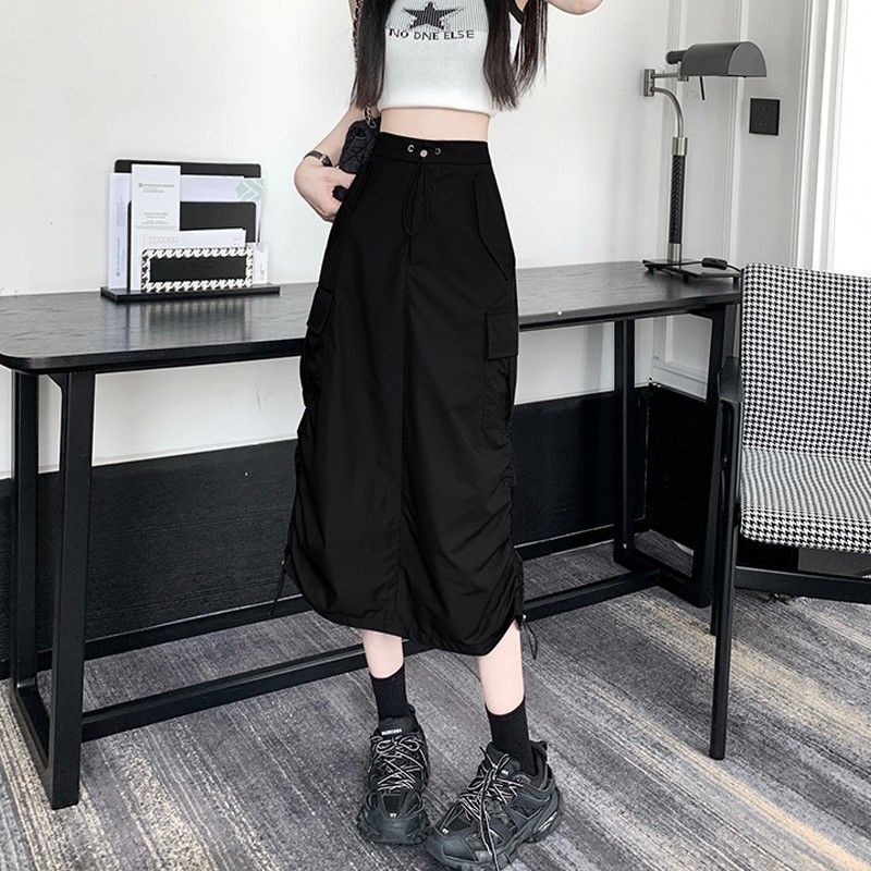 大きいサイズの婦人服の黒い百倍のスカートの女性の夏の2024新型の高腰の半身のスカートの太っているmmはやせているa字のスカートの潮が見えます。