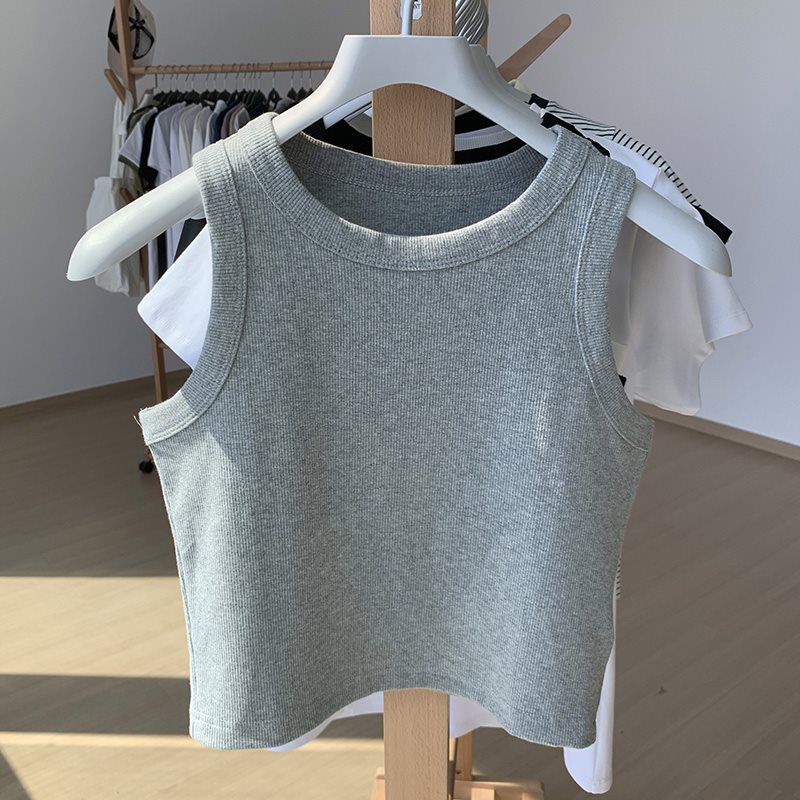 女性用グレーベスト、ショートへそ出し、大きいサイズ、小さなサスペンダー、I字型ボトムス、ノースリーブアウター、黒のスポーツトップ