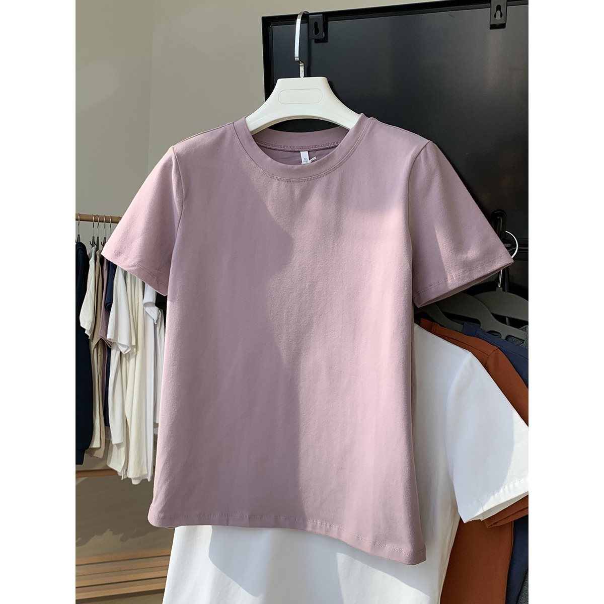 タロパープルコットン半袖ラウンドネックルーズで多用途カジュアルスリムシンプルベーシックトップ無地Tシャツレディース夏