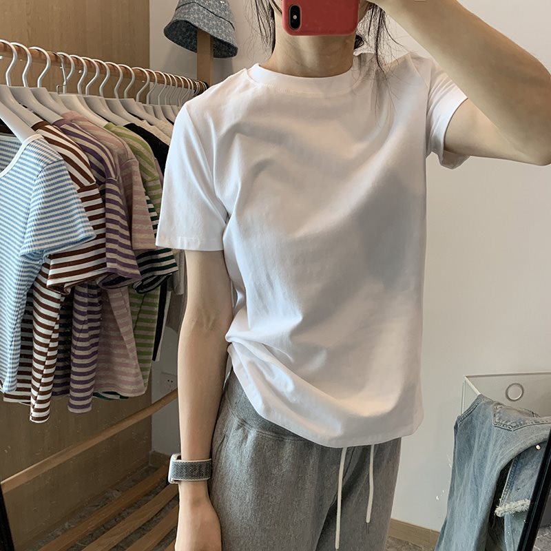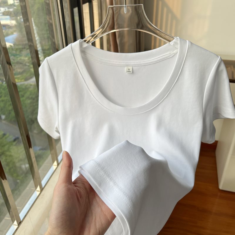 女性用半袖Tシャツ2025無地夏スリムフィット万能ラウンドネックTシャツトップス右肩ヨーロッパとアメリカの綿