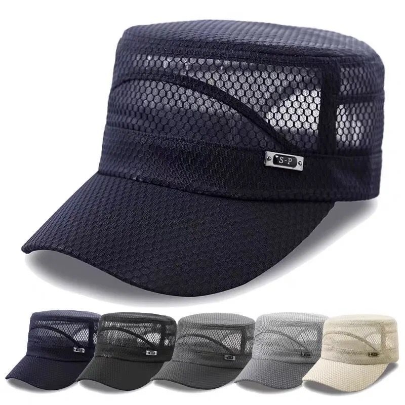 夏の新しい帽子メンズフラットトップキャップカジュアルアウトドアサンシェード日焼け止め帽子メッシュ通気性釣り帽子