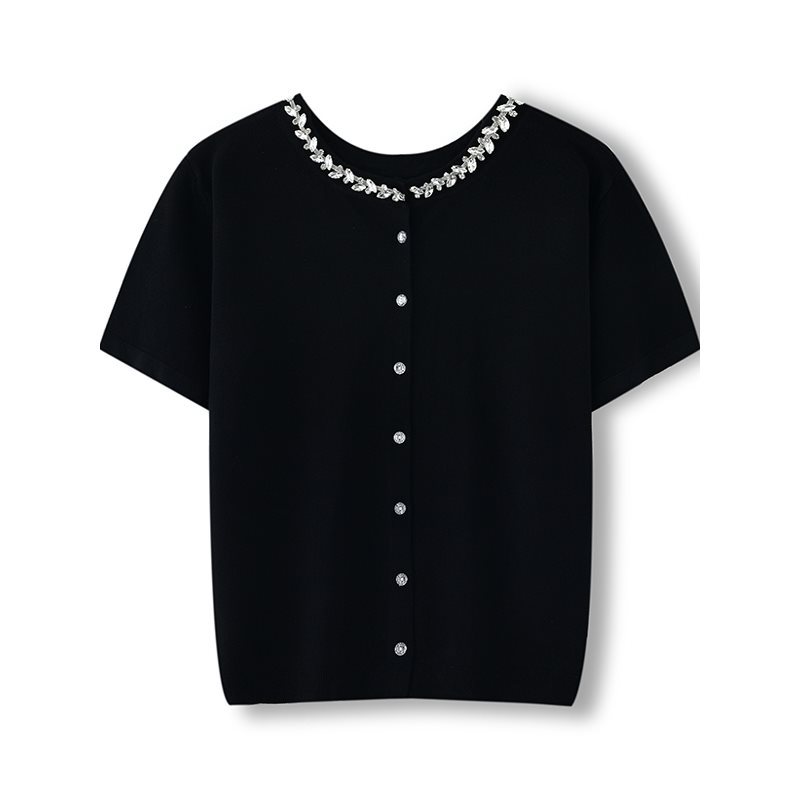 春夏の新作ラウンドネックダイヤモンド半袖アイスシルクカーディガンレディースルーズショートスタイルスカート付きブラックトップ