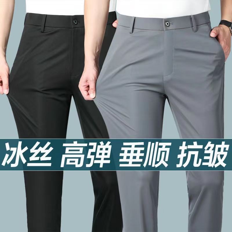新しい夏の氷糸カジュアルパンツ中年男性の無熱弾力2024ズボンビジネス弾力高腰ストレートパンツ