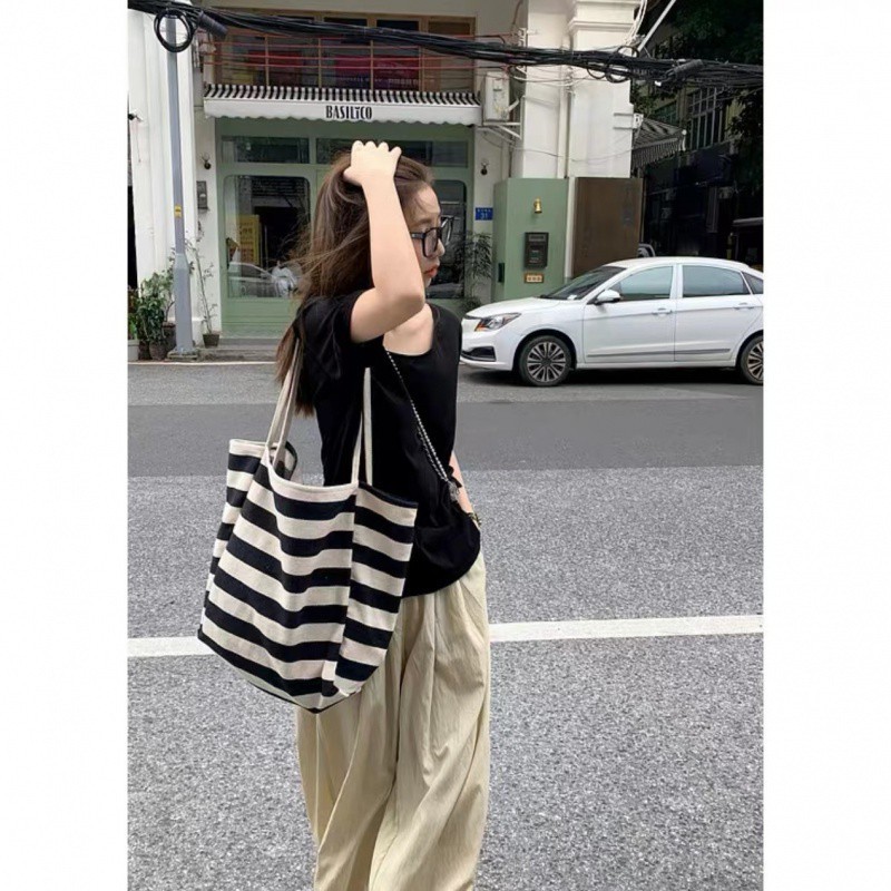 ズックの大きい包みの2024新型のファッションは色のストライプの特包の女性の大容量の肩掛けの授業の出勤する包みにぶつかります。