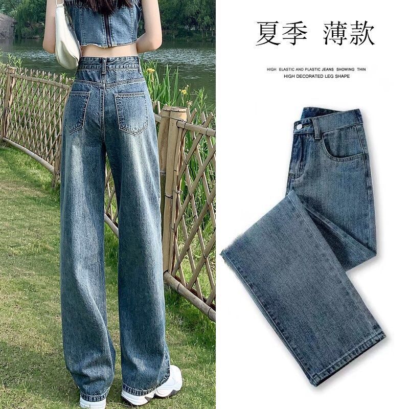 レトロな腰の高いジーパンの女性の夏の薄いタイプのまっすぐな筒の広い足のズボンはやせているまっすぐな筒の小さい子供を現して百合引きずってズボンの潮を引きずっています。