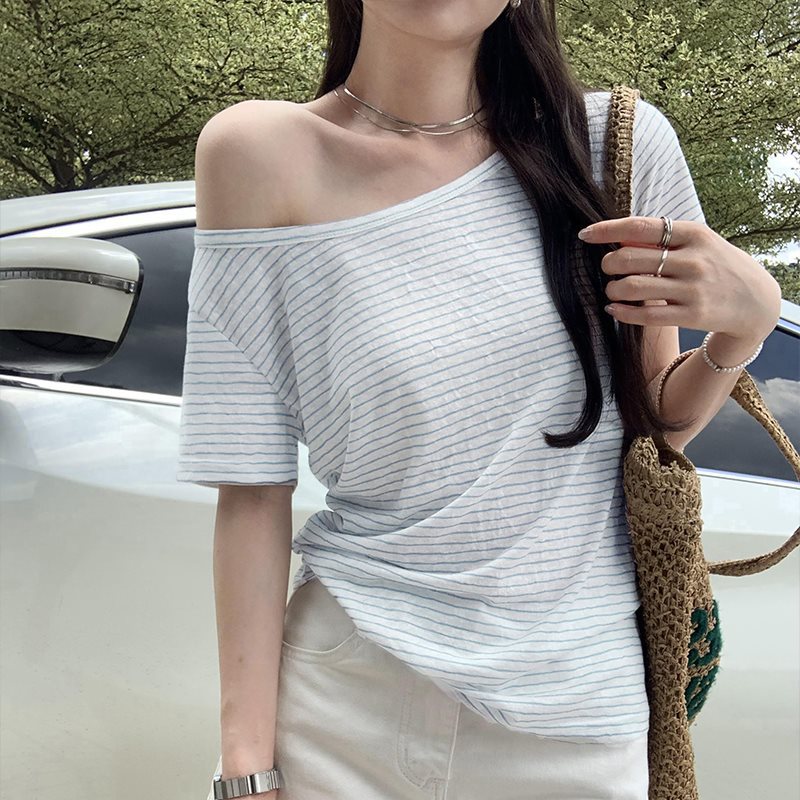 suseyiku 今年人気の美しい気質オフショルダーワイドカラー半袖Tシャツレディース2025年夏新作万能トップス