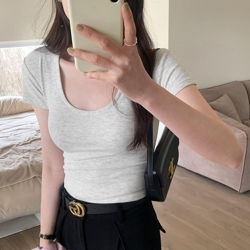 suseyiku U ネックスリムショートウエスト露出半袖 Tシャツレディース夏新作右肩痩身万能ホットガールトップ