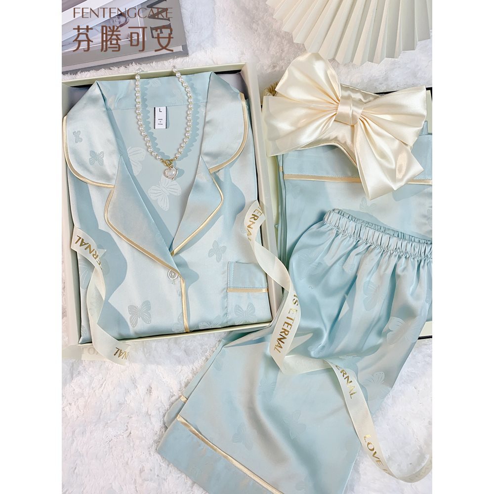女性用胸パッド付きアイスシルクパジャマ、夏用シルク風半袖ズボン、親友と母親へのギフトボックス入りの3点セット
