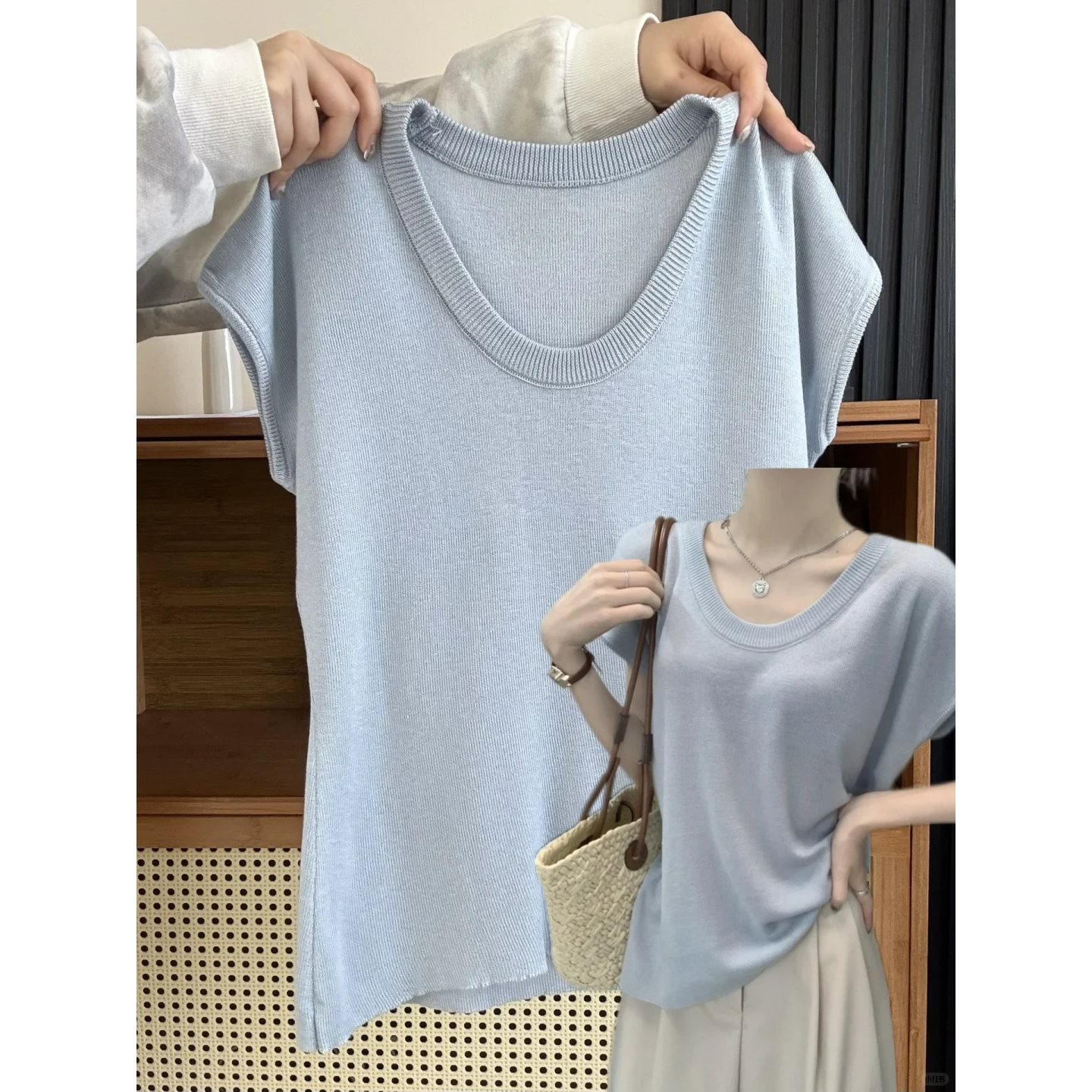 薄いアイスシルク U ネック鎖骨漏れニットセーター女性のための夏の小さなフライングスリーブルーズカジュアル半袖リラックスボトム Tシャツ