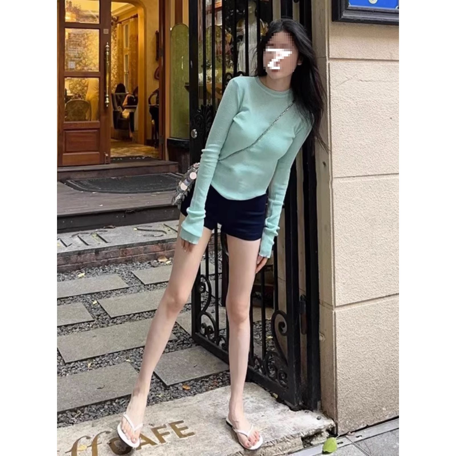 2025 韓国秋の新ガールハートミントグリーンセクシーなわずかに薄いニットセーター長袖 Tシャツ女性のトップス