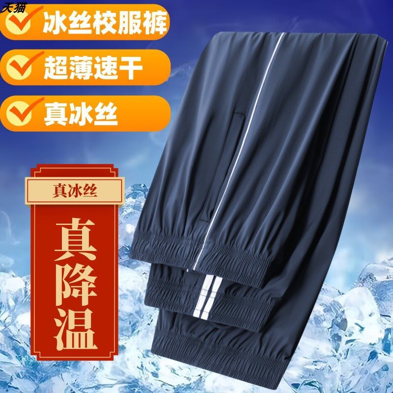 夏用薄氷シルク学生服パンツ、ネイビーブルー中学生・小学生用、2本のストライプのネイビーブルー学生ズボン