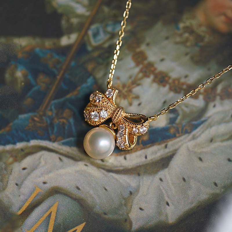 オリジナルデザインの蝶結びの淡水真珠のネックレスには、ダイヤモンドの少女が18kの金色の鎖骨のネックレスをメッキしています。