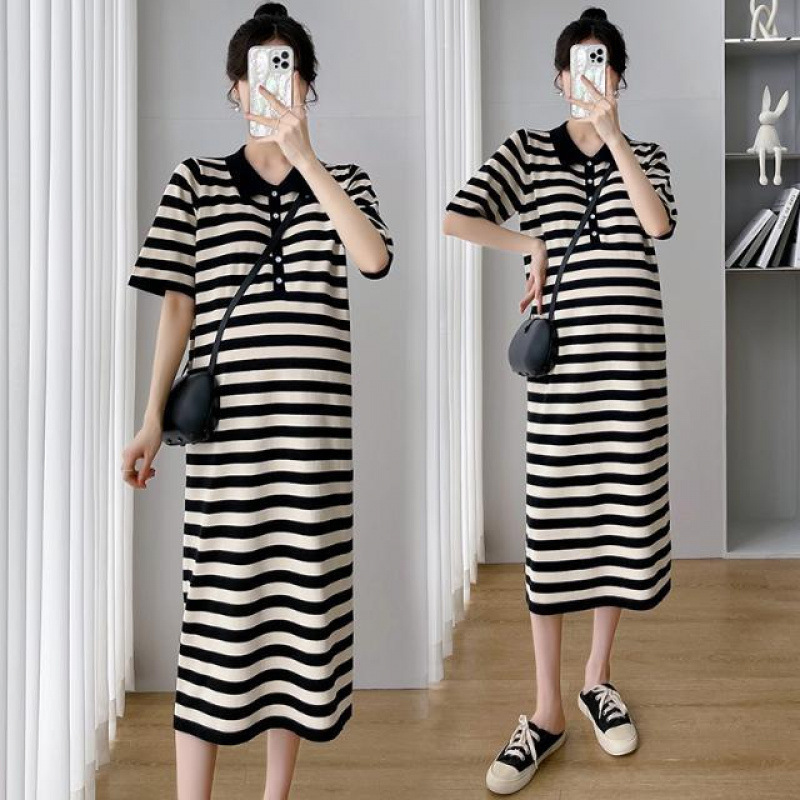 ストライプドレスマタニティ夏の新しいアイスシルクニットロングスカートルーズミッドレングス大きいサイズ卸売メーカー