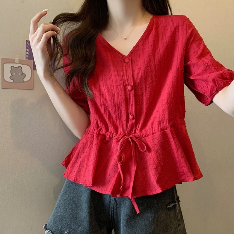 花柄トップス赤Vネックシフォンシャツ半袖レディース夏大きいサイズおしゃれで美しいシャツ巾着ウエスト痩身