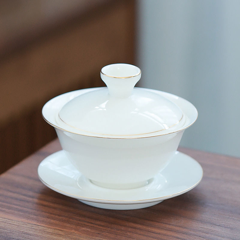 徳化羊脂翡翠白磁シングルゴールドカバーボウルティーカップセラミック大型ティーセット家庭用カンフー三才茶ボウル