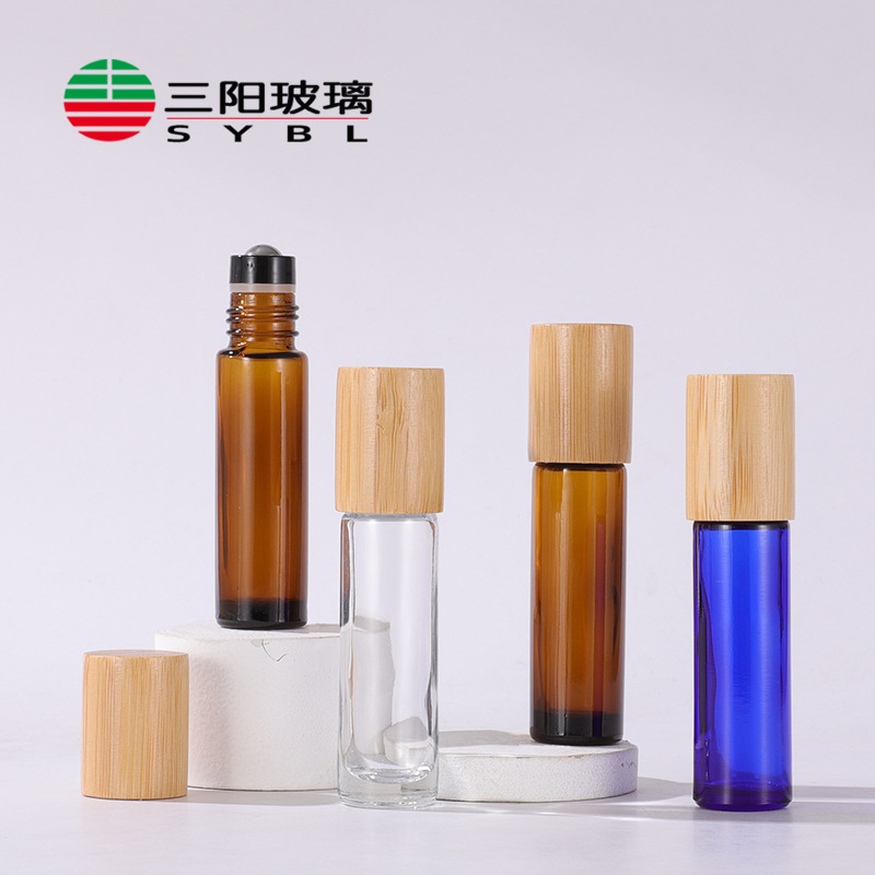 10mlロールオンボトル 10ml茶色・青色エッセンシャルオイルボトル 竹製キャップ付き透明ロールオンボトル 香水詰め替えボトル 木目調キャップ