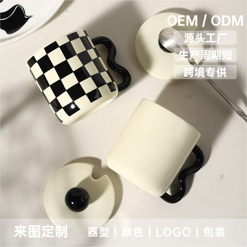 カスタムマグカップ棋盤格レトロ陶磁器蓋付き特色ハンドルカップオフィスコーヒーカップ家庭用牛乳カップ