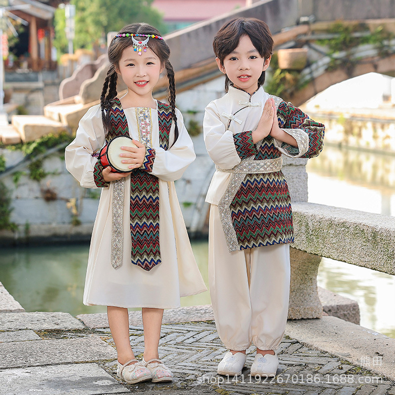 子供のミャオ族の服装の新疆少数民族の時代劇の男の子の西域風の女の子の出演服の異国風の王女のスカート