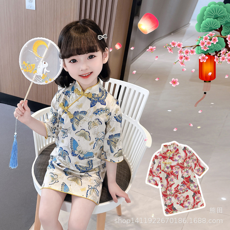 子供の春の長袖のチャイナドレスの女の子のチャイナドレスの洋風の中国風の女の子の赤ちゃんの蝶のツルの唐は中国風を装います。