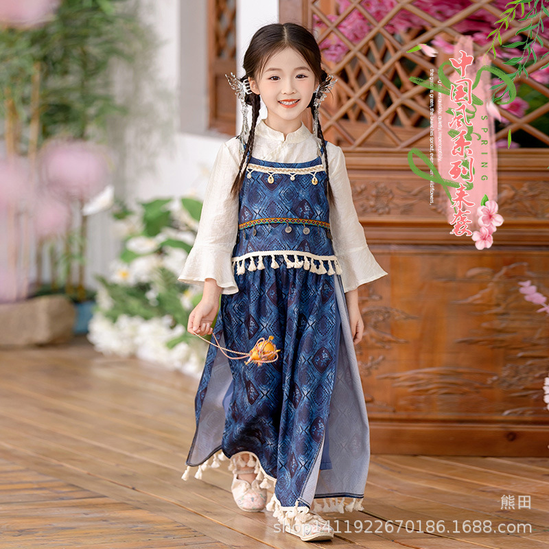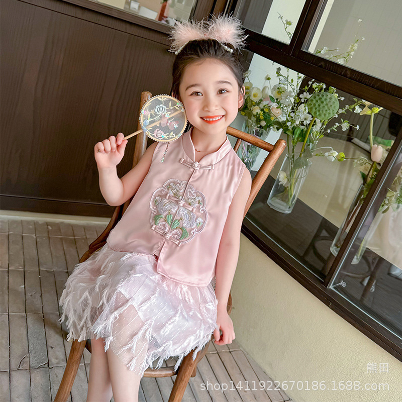 女の子の新しい中国式のスーツの新型の中小子供の国風の夏服のノースリーブのベストのフリンジスカートの2つのセットのガーゼのスカート