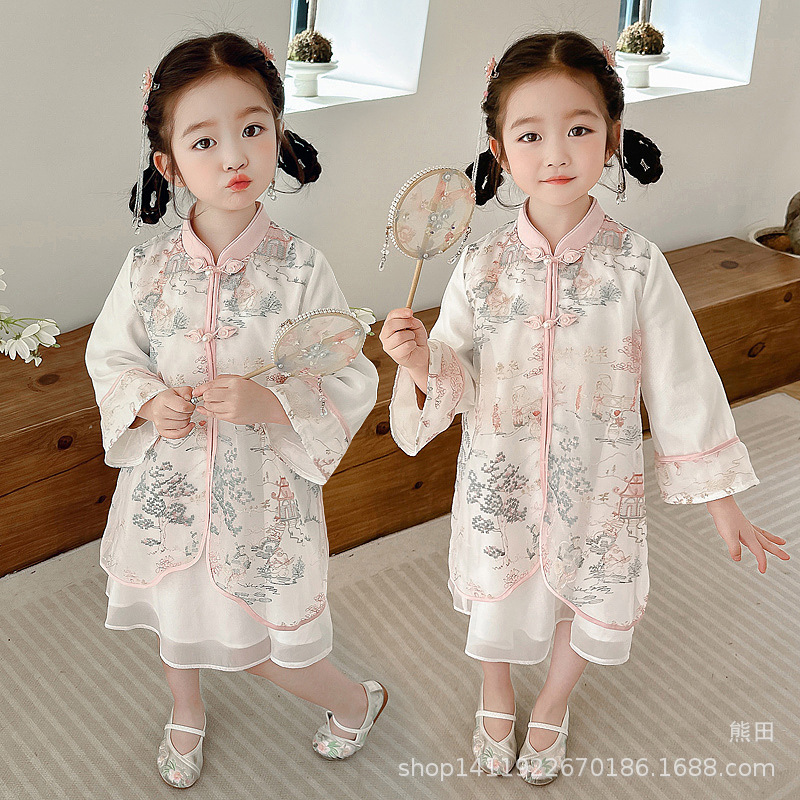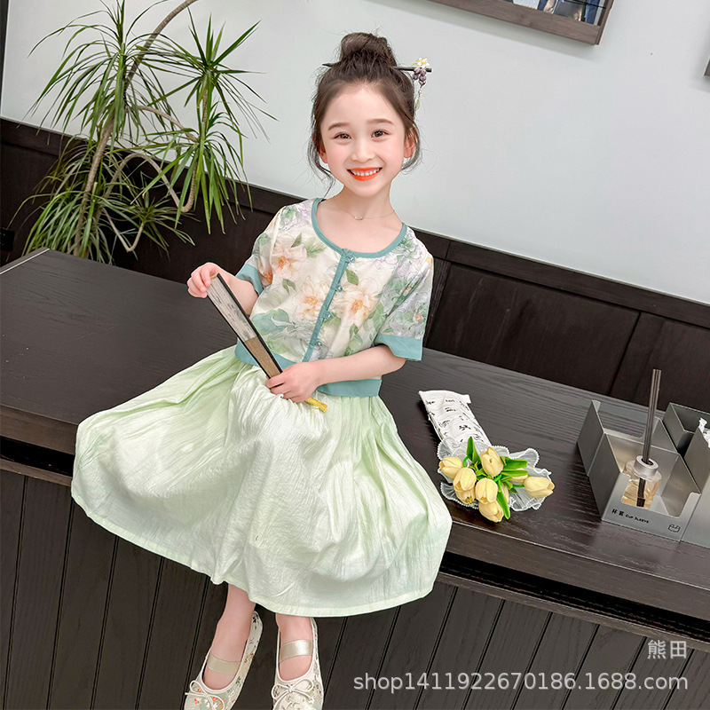 女の子のスーツの夏2025新型子供の洋気中国風の女性の赤ちゃんの薄いタイプの漢服のスカートの夏服の古風