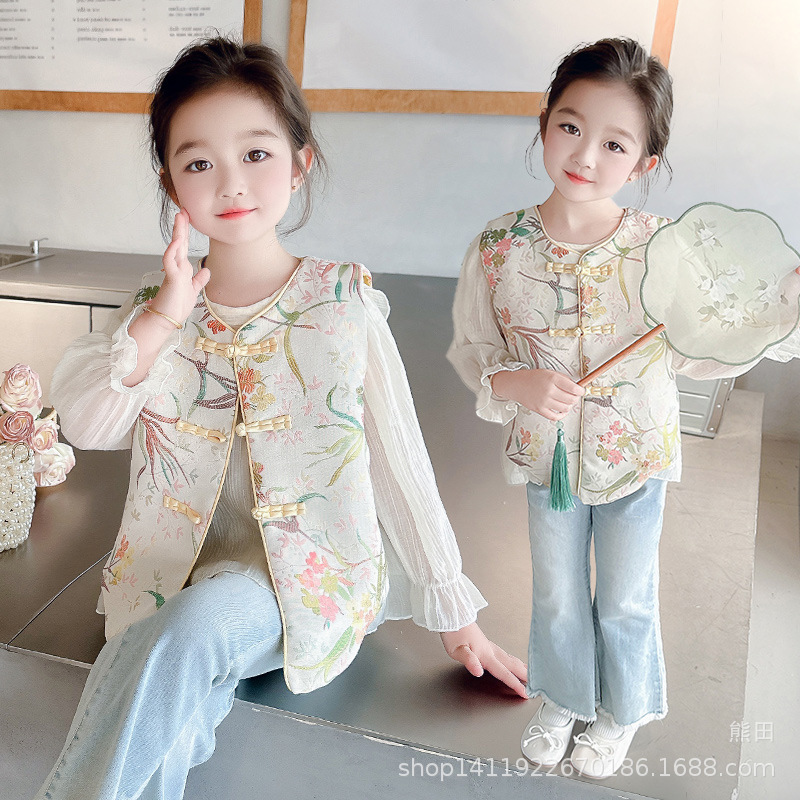 女の子セット春秋2025新型子供洋気国風馬甲女の赤ちゃん中国式シャツ秋服2点セット
