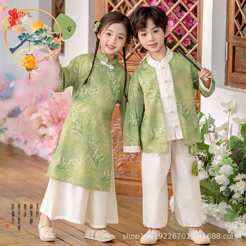 子供2025新型中国風スーツ男の子新中国式唐装女の子チャイナドレス演技服国潮古風