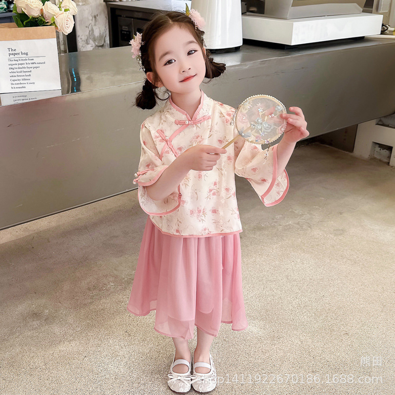 子供のチャイナドレスの時代服の女の子の中国風の改良花のチャイナドレスのセットの赤ちゃんのレトロな漢服のスカート