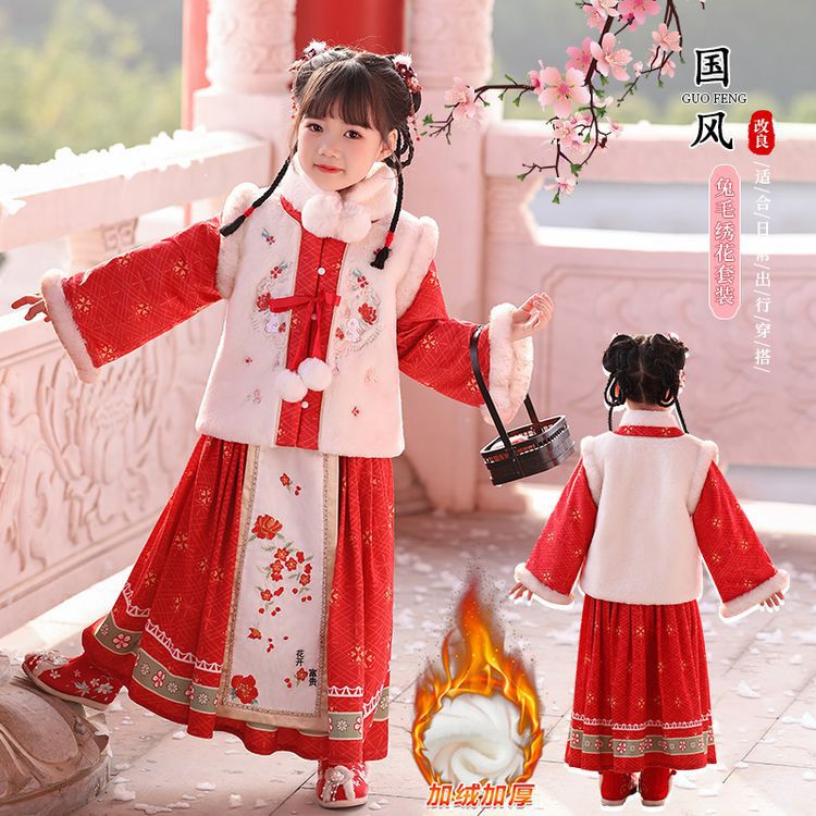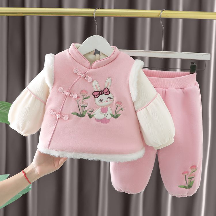 女の子の新年の服のウサギの馬のスカートのスーツの2024の新型の冬の服の子供の唐の服の厚い正月の服の2つのセット