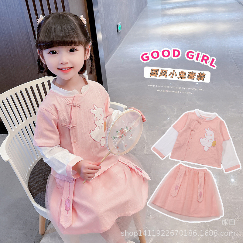 女の子の新型中国風のスカートの小さいウサギの漢服の春の長袖のスーツの新しい中国式の唐の服のスカートの偽の2枚