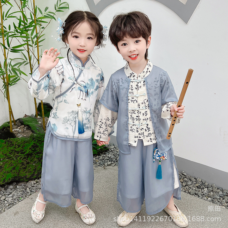 女児唐装演出服学校演出服子供漢服男児長袖中国風男児古着セット
