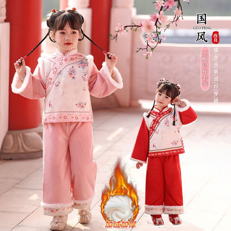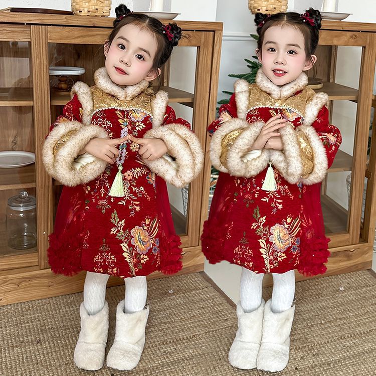 女の子の新年の服冬の2024の新しい子供の新しい中国式の新年の服とベルベットの厚い中国風の女の子の唐服