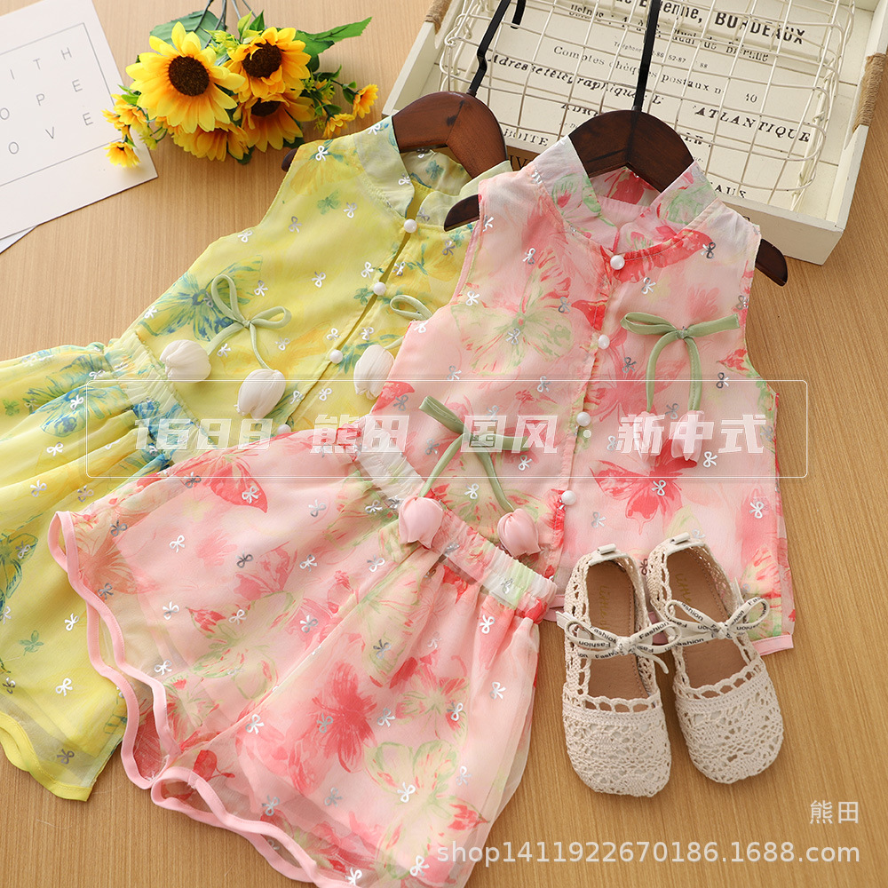 子供のレトロな夏のスーツ女の子蝶ノースリーブ中国風かわいい 2 点セット 2025 新しい中国風のベスト