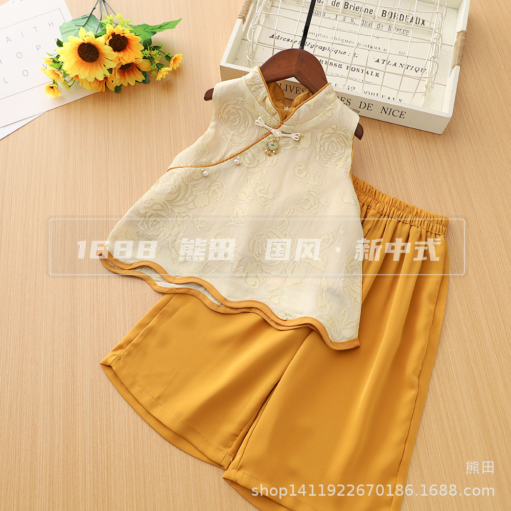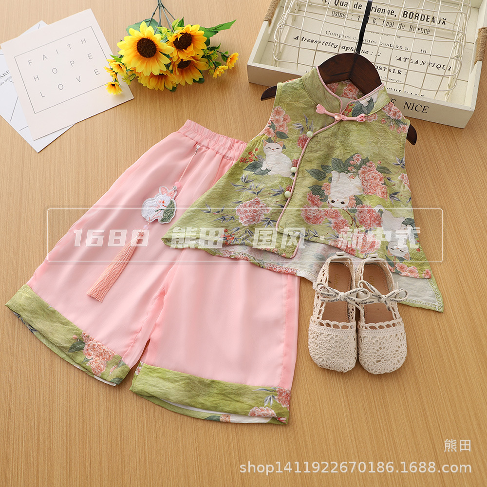 子供の漢服スーツ夏 2025 新しい女の子中国風ベビーファッショナブルな新しい中国風ノースリーブクール 2 点セット