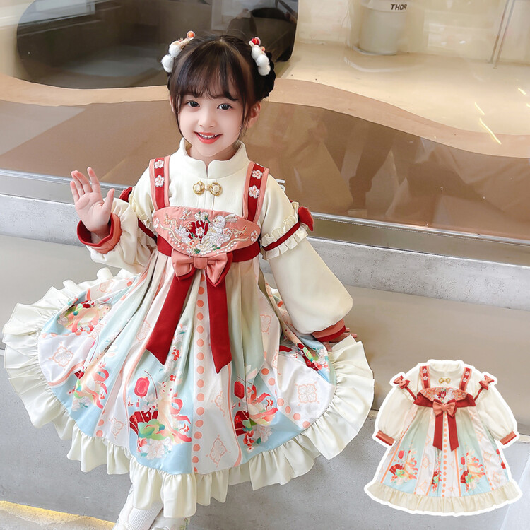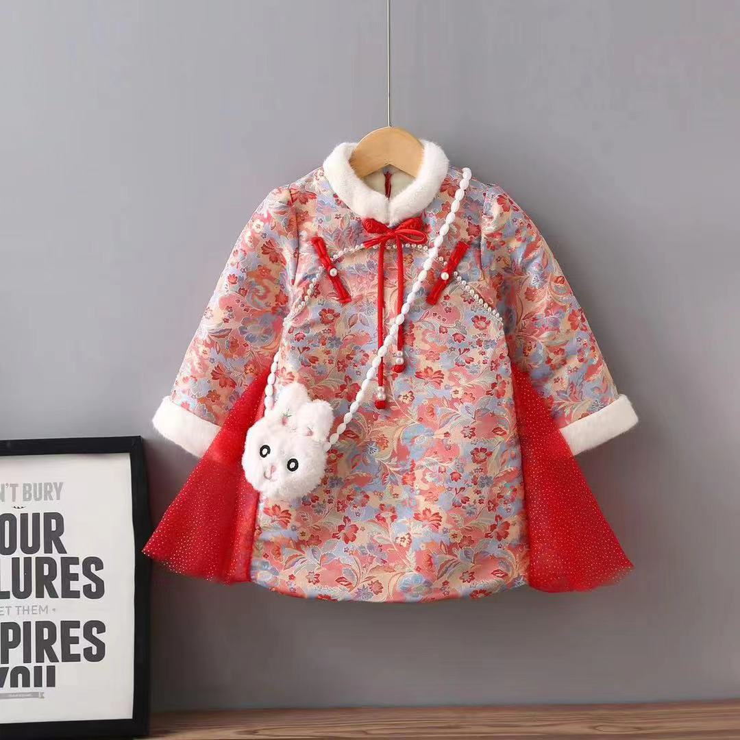 2023新しい冬の子供のチャイナドレスの洋気プリントプリンセススカート中国風の民族の女の子のワンピース