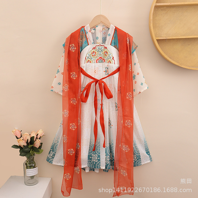 漢服の女の子の夏の女の子の古風の唐の服のスーツの民国の風の服装の春秋の薄い金の子供の国慶節の公演服