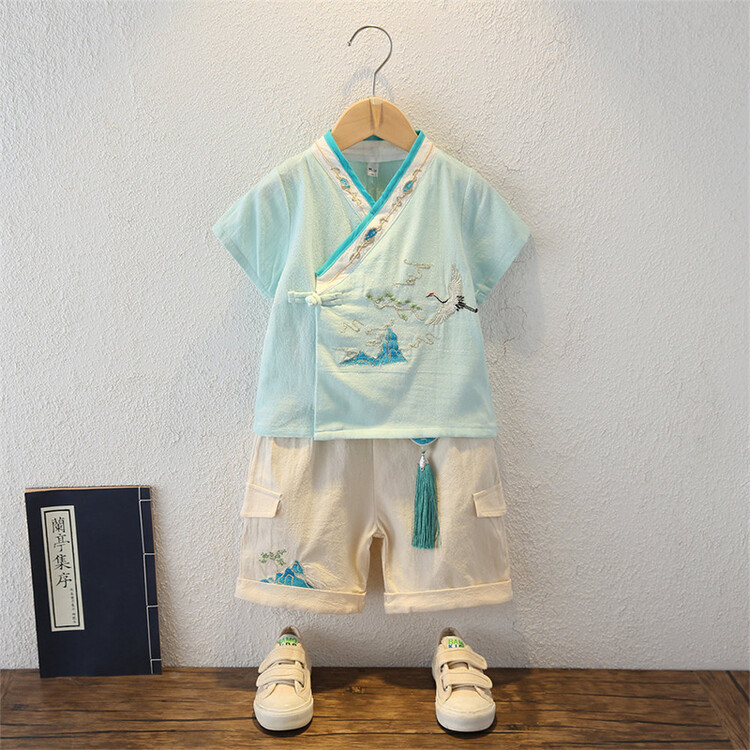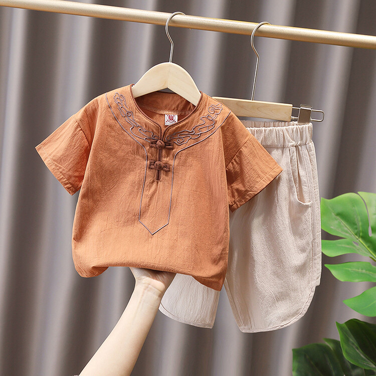 男の子の唐の服のスーツの漢服の夏の薄いタイプの子供の中国風の2つのセットの赤ちゃんの夏服の時代の子供服のファッション