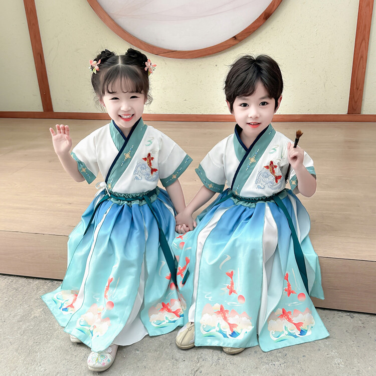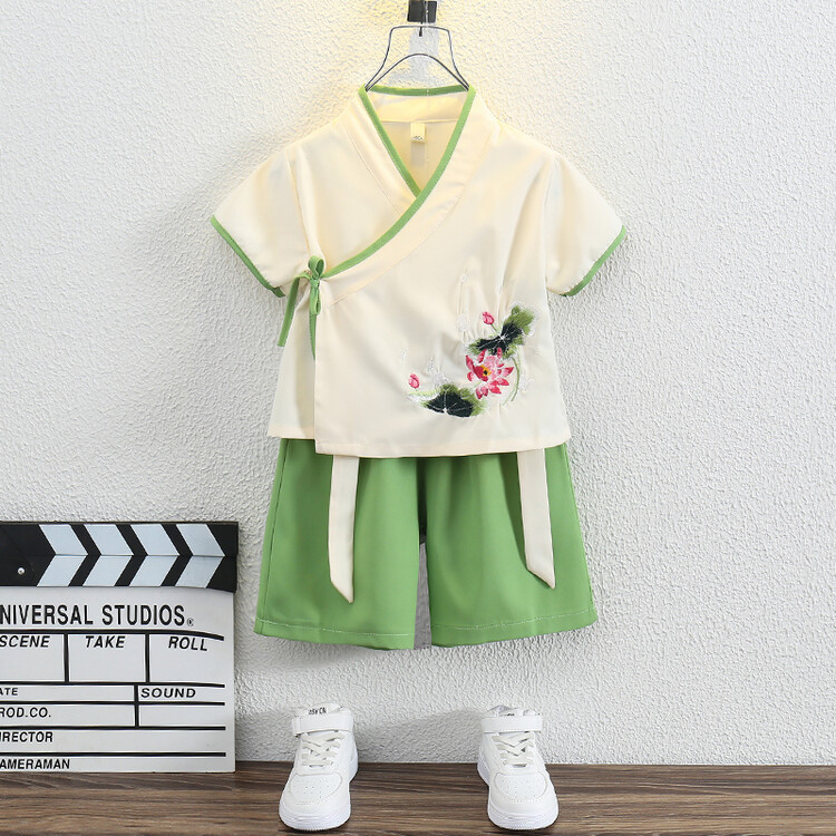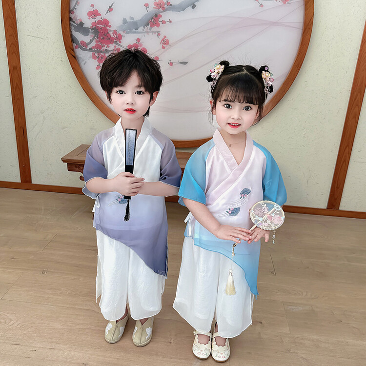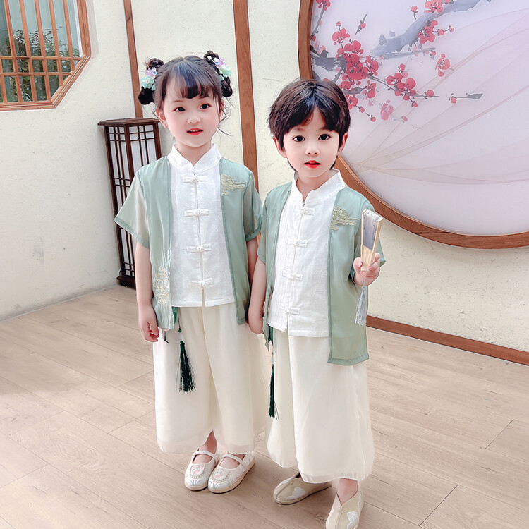 男の子の唐の服のスーツの漢服の夏の薄いタイプの子供の中国風の2つのセットの赤ちゃんの夏服の時代の子供服のファッション