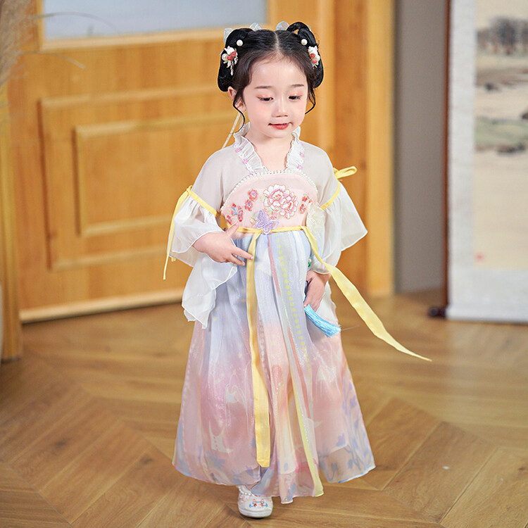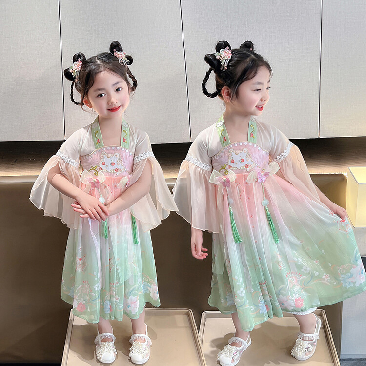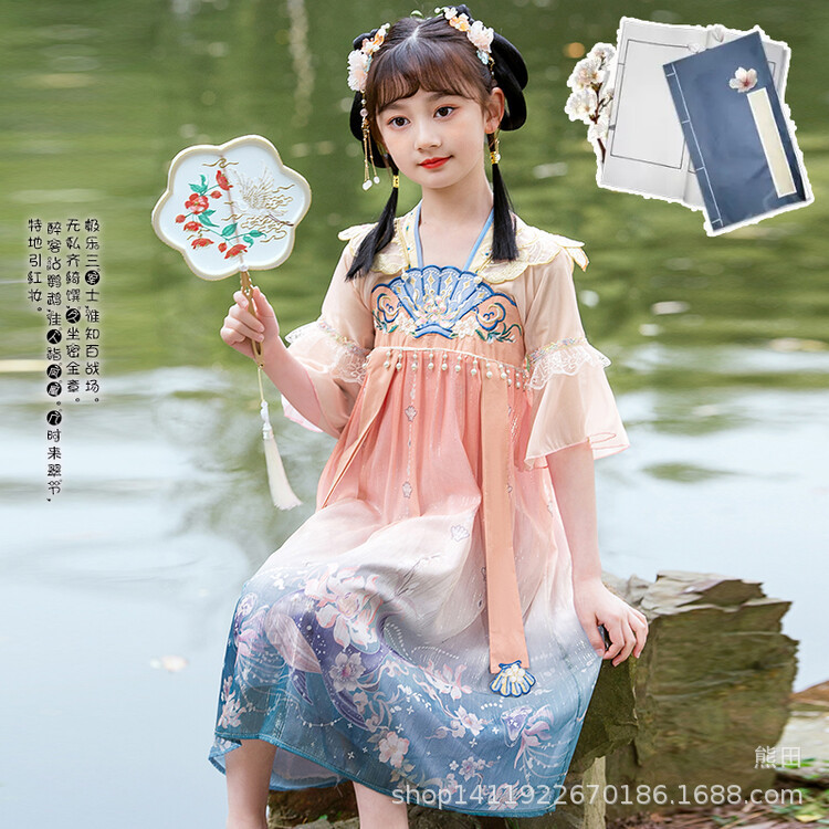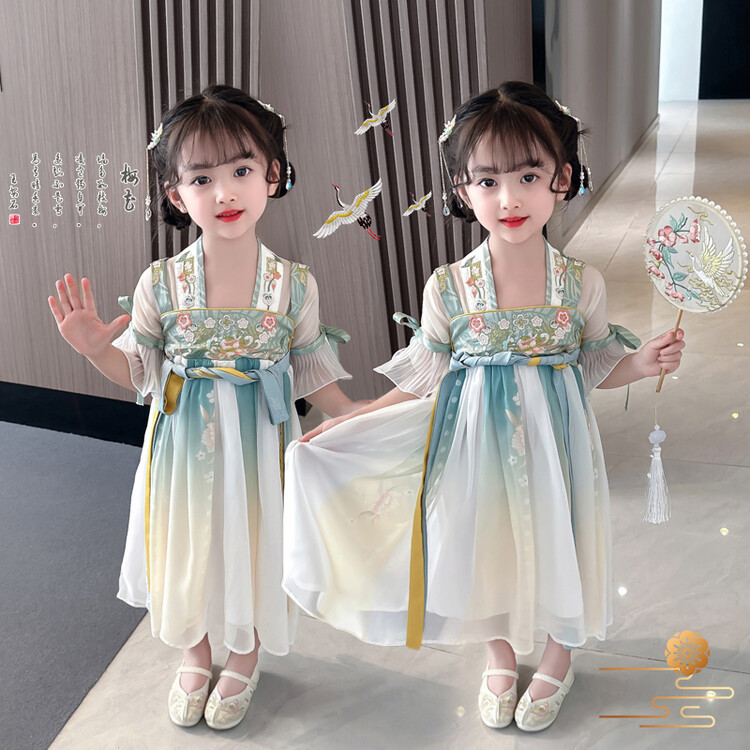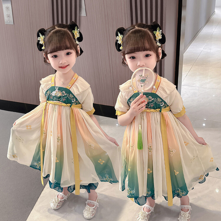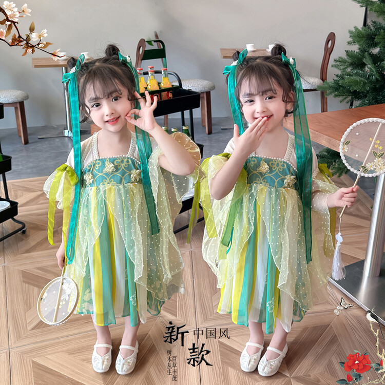 漢服の女の子2023春夏の半袖のスカートの子供の時代のワンピースの超仙の中国風の王女のスカートは卸売りします。