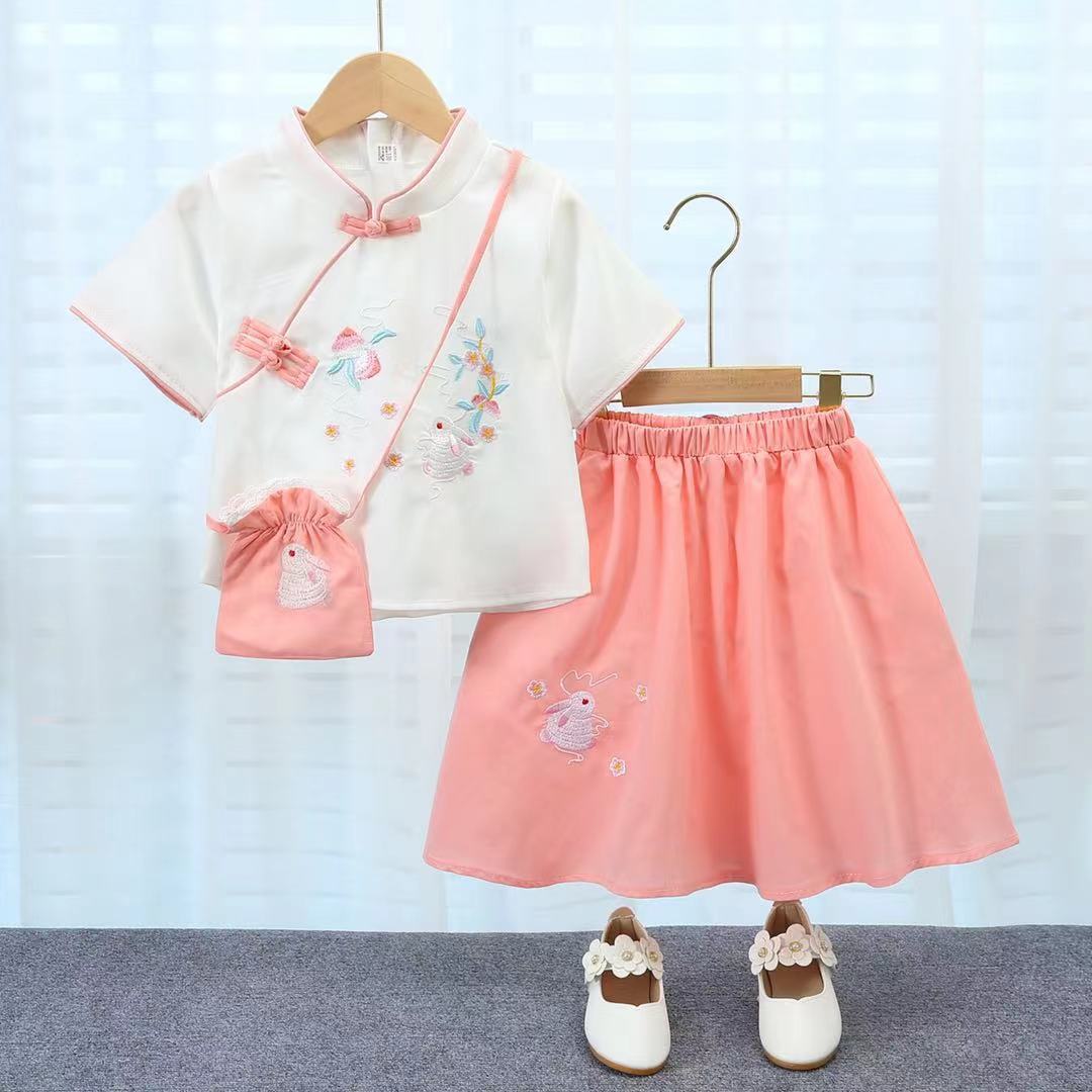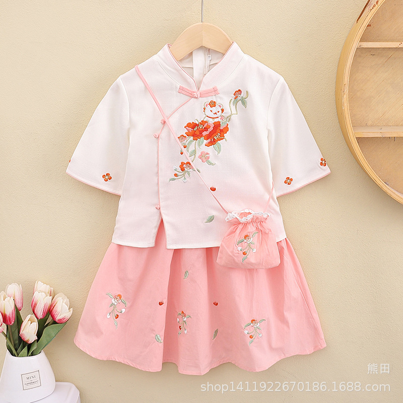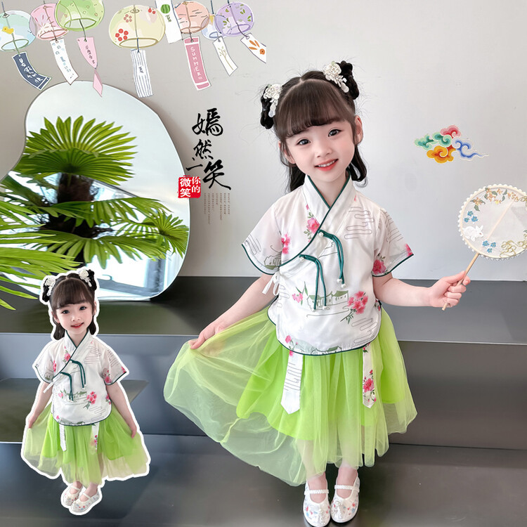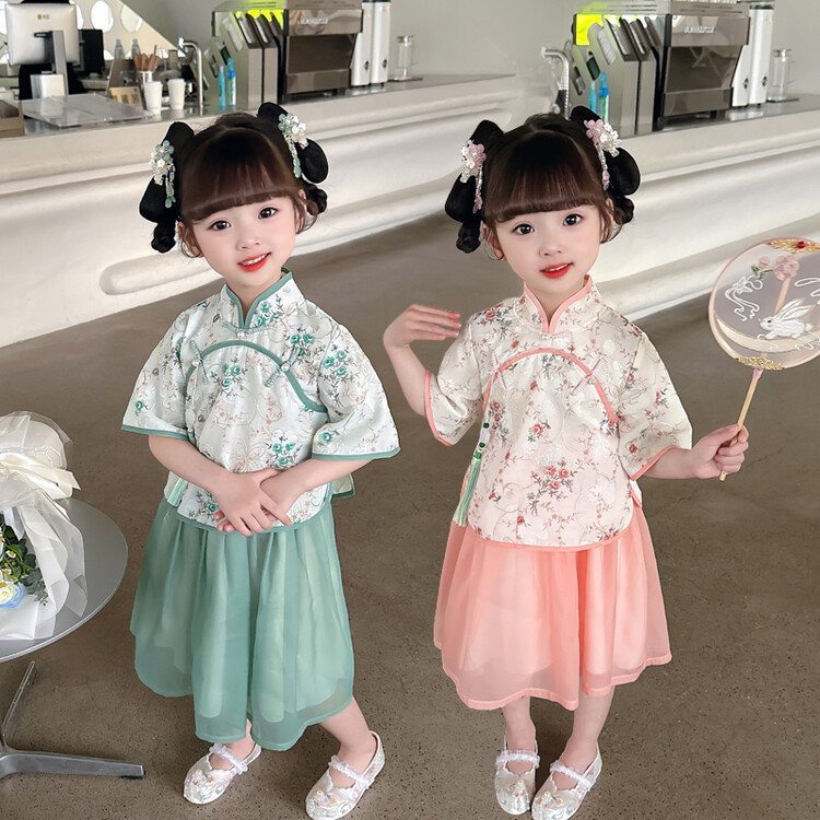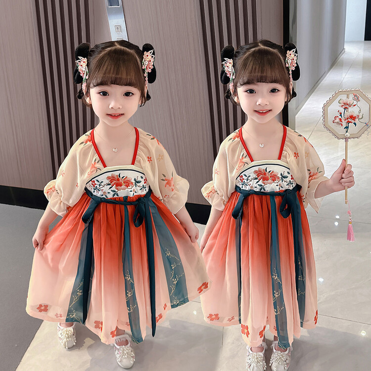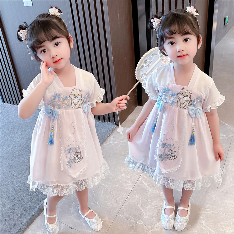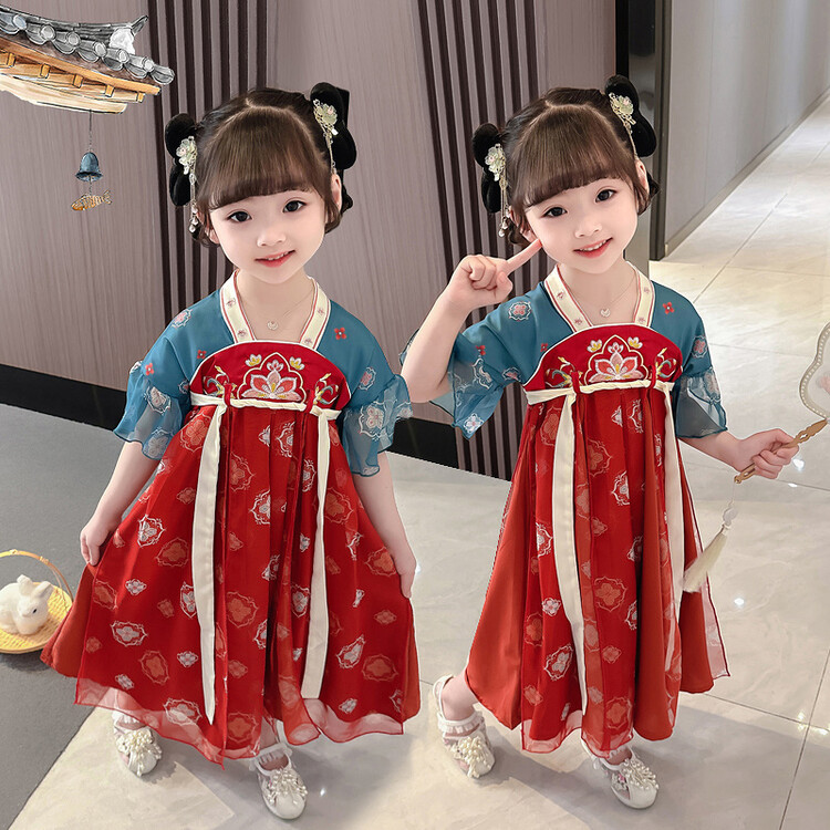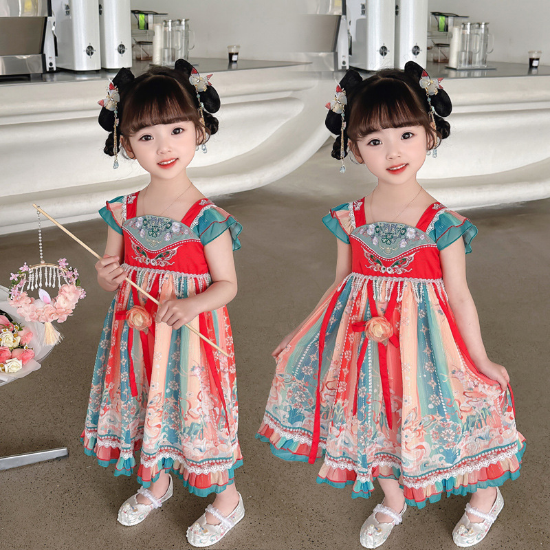子供の漢服の夏の女の子の唐装のチャイナドレスは漢服のデニムのスカートの女の子の国風の子供服の民族風の時代の服を改良します。