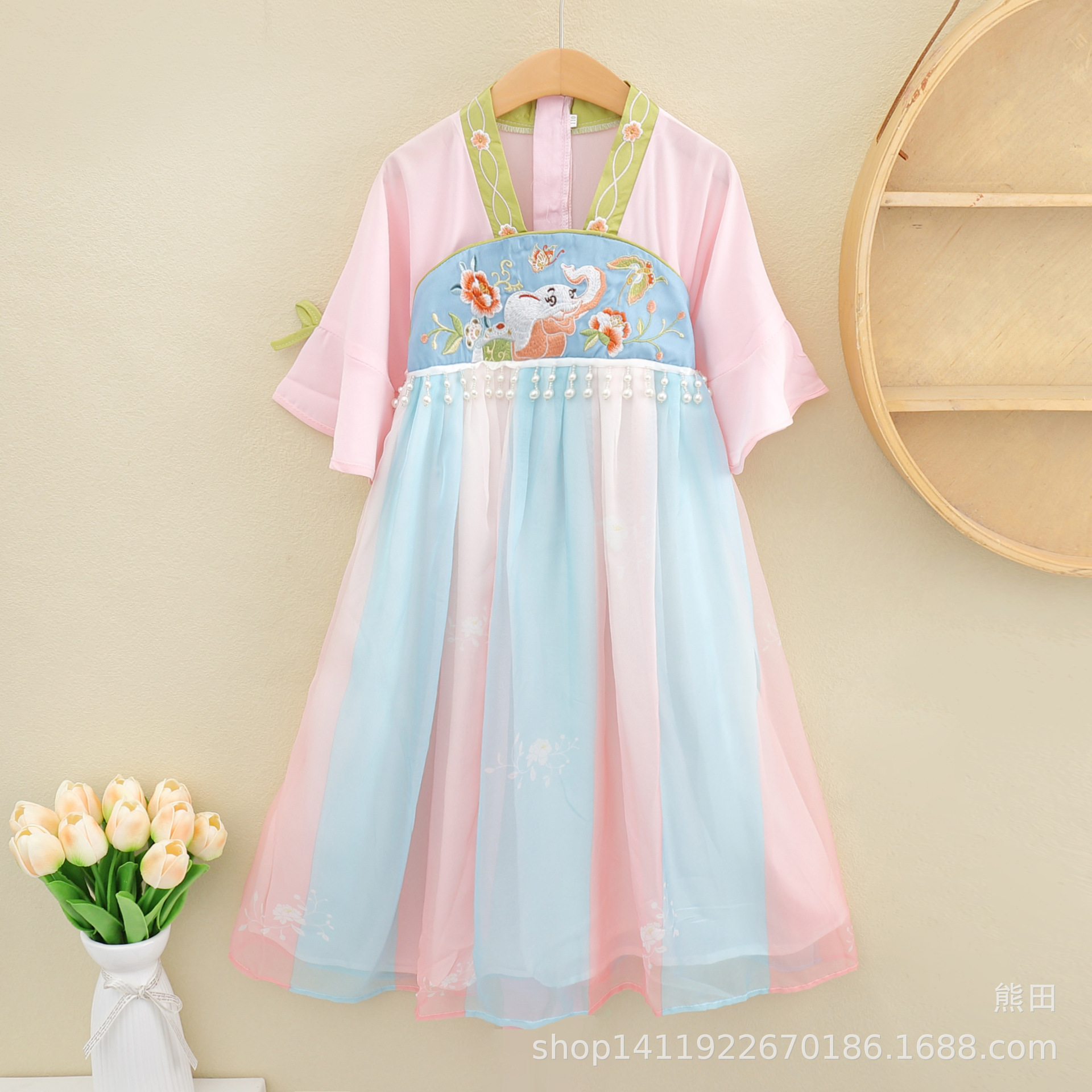 新型の漢服の女の子の夏の半袖の漢服の薄いタイプの超仙ののスカートの子供の時代の服の中国風の斉のの唐の服のデザイン