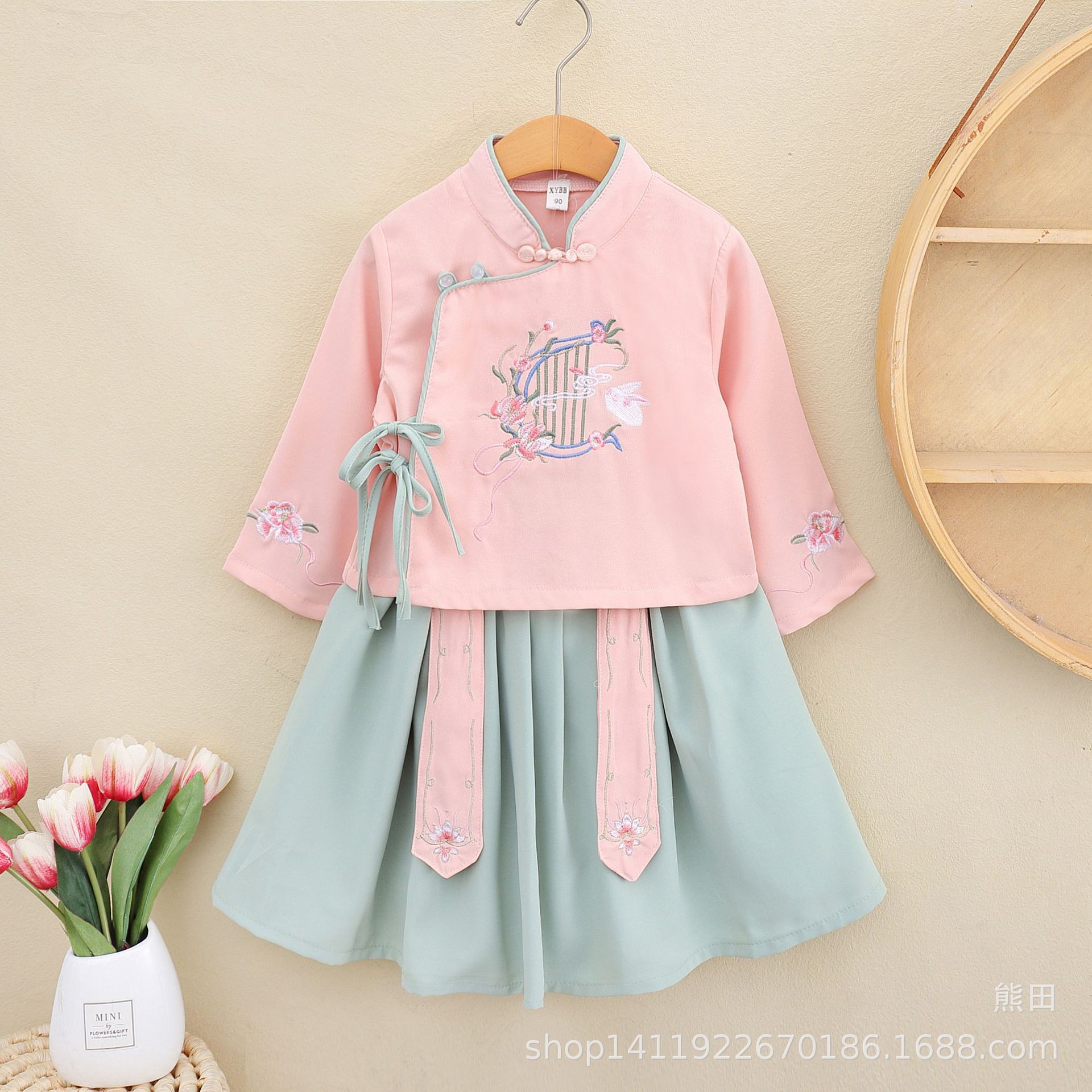2020中国風の女の子の2つの花のチャイナドレスの女の子の唐のチャイナドレスの刺繍の女の子のチャイナドレスの衣装