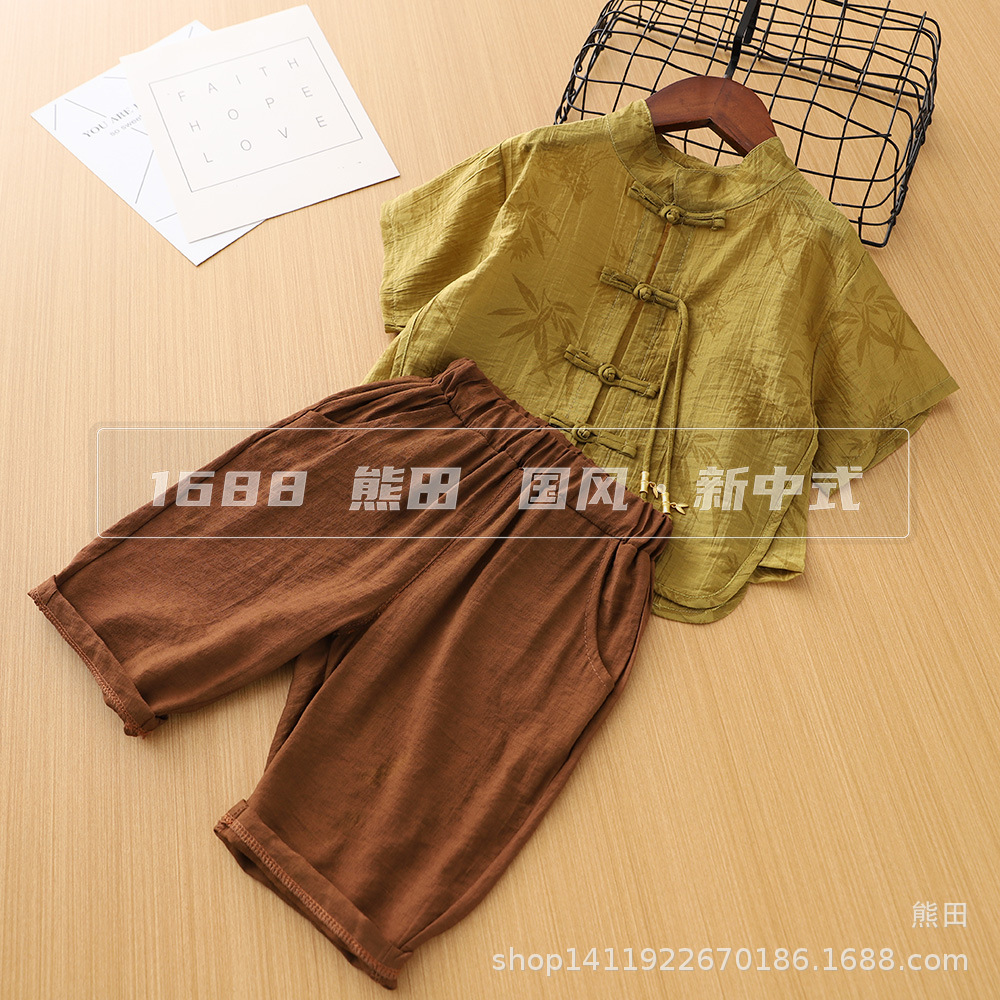 子供の漢服の男の子の夏の半袖の新型の国風のスーツの女の子の唐服の赤ちゃんの中国式の民族の縫い目は服の潮を演出します。