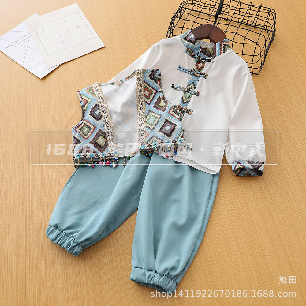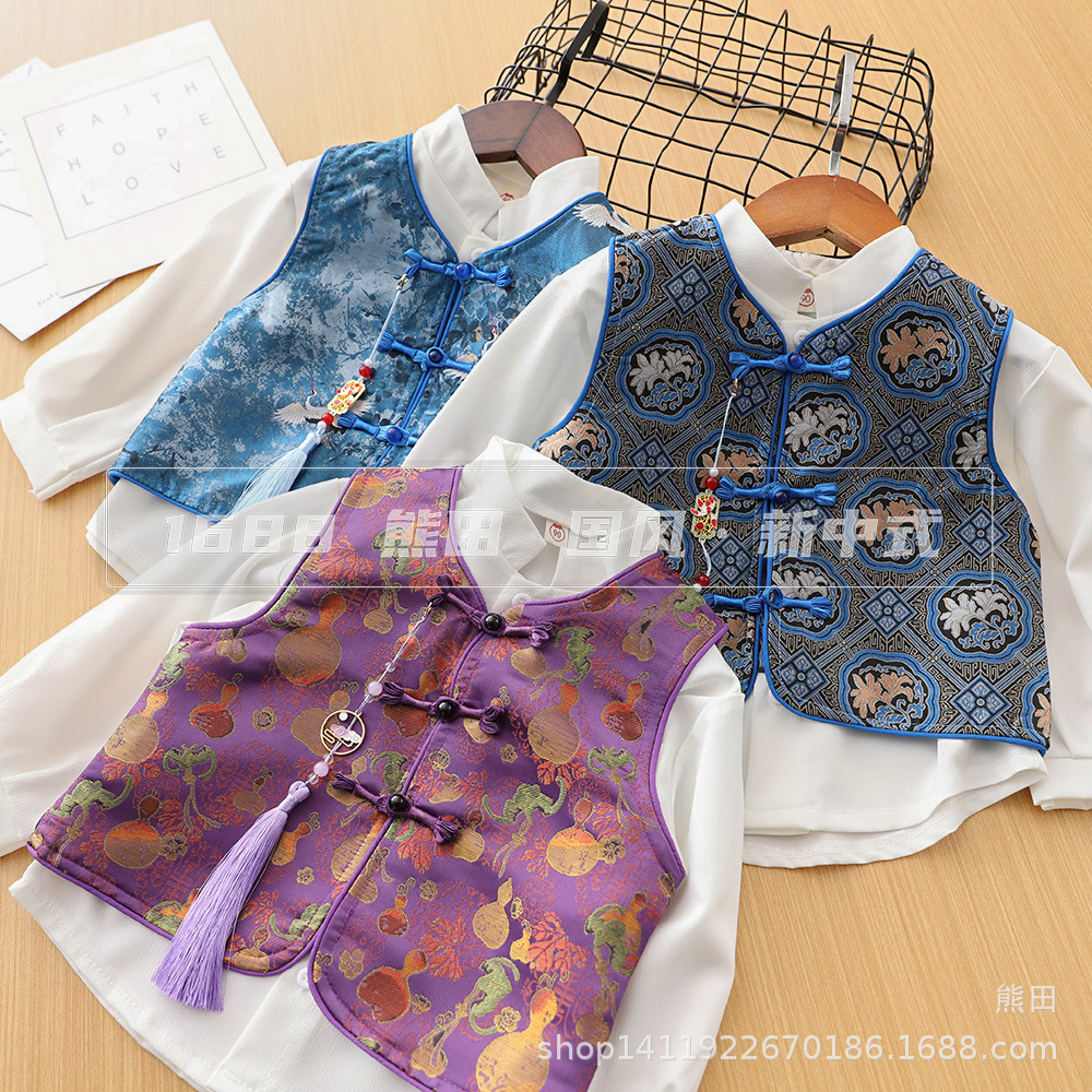 子供中国風盤バックル馬甲唐装三点セット春金長袖新中国式古国漢服男児演技服