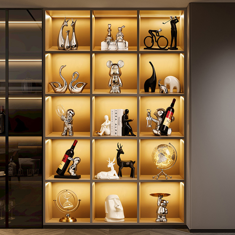 暴力的な熊の酒の棚の装飾品は現代の軽くて豪華な高級な客間のワインの棚の家庭のガラスの展示棚のセットを並べます。