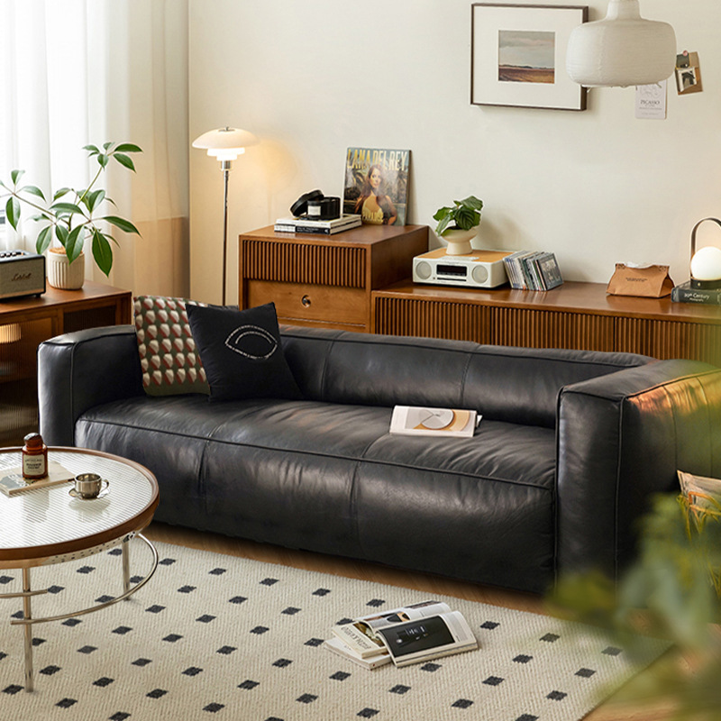 北欧オイルワックス真皮ソファーリビングルームのトップ層牛革豆腐ブロック三人の小戸型レトロな黒いストレートソファ