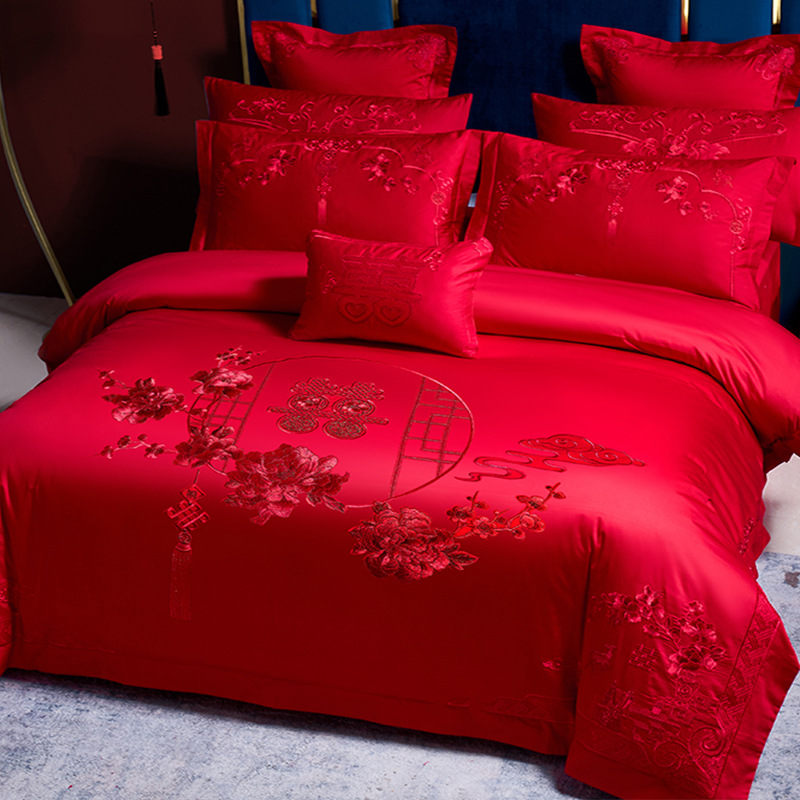 赤い双喜結結婚祝い刺繍四点セットの功サテン喜嫁布団カバーの長絨毛綿は多くのベッド用品を嫁がせています。