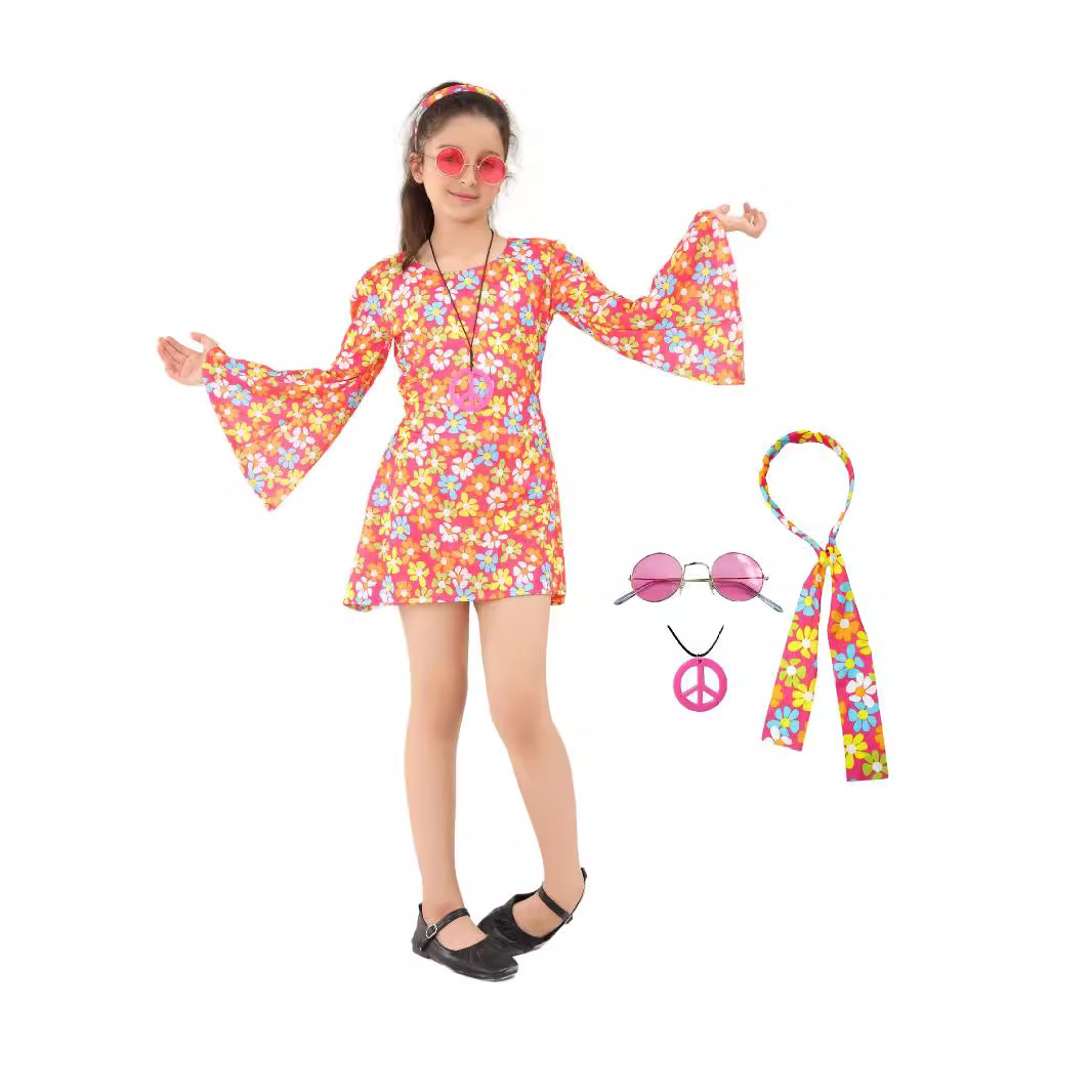 年代のパーティーの舞踏会の役はワンピースのメガネのカチューシャを演じて平和なネックレスのヒッピーのワンピースの子供を装います。