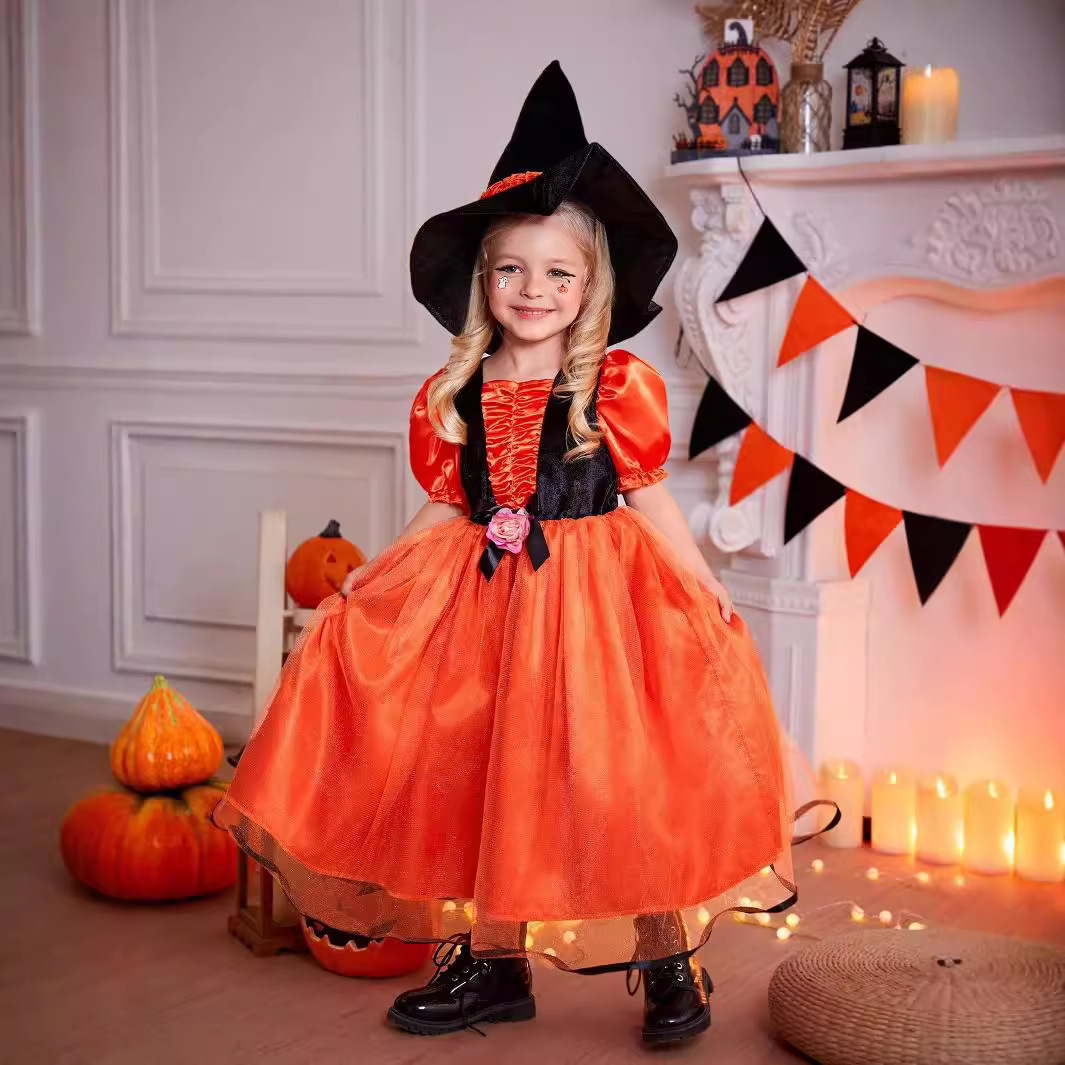 ハロウィーン女の子子供ワンピースカボチャ魔女帽子パーティーワンピース国境を越えた魔女オレンジ色のスカート服装